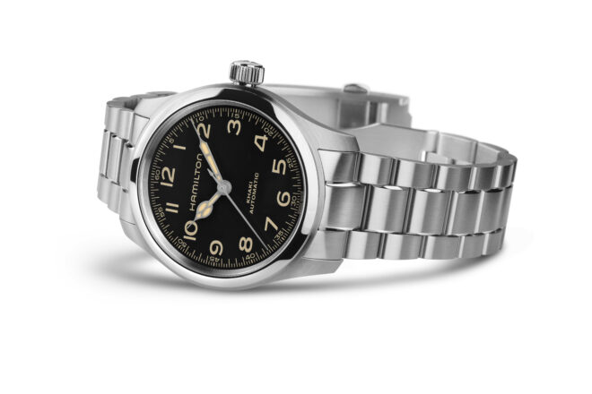 Die Originalversion der Filmikone präsentiert sich mit einem neuen modernen Detail. Auf einem schwarzen Zifferblatt präsentieren sich die Ziffern der Khaki Field Murph in leicht gewölbter Form und bieten dadurch eine optimierte Ablesbarkeit. Die Kathedralzeiger verleihen dem Zeitmesser eine markante Vintage-Optik. Die 38-mm-Originalversion begeistert die Herzen von Hamilton- und Hollywood-Fans gleichermassen und ist ab jetzt mit einem gebürsteten, dreireihigen Metallarmband erhältlich.